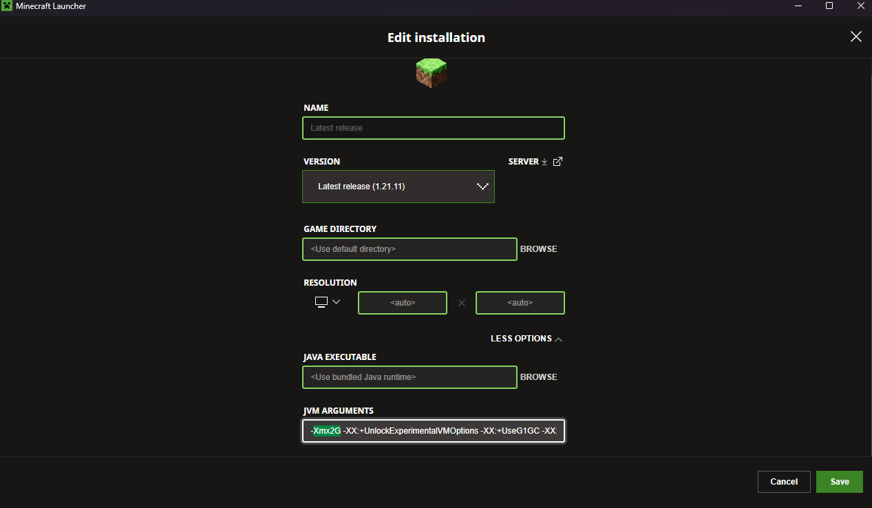 Hover over the version you play (e.g., “Latest Release” or “Forge 1.21”) and click the Three Dots (…) > Edit.