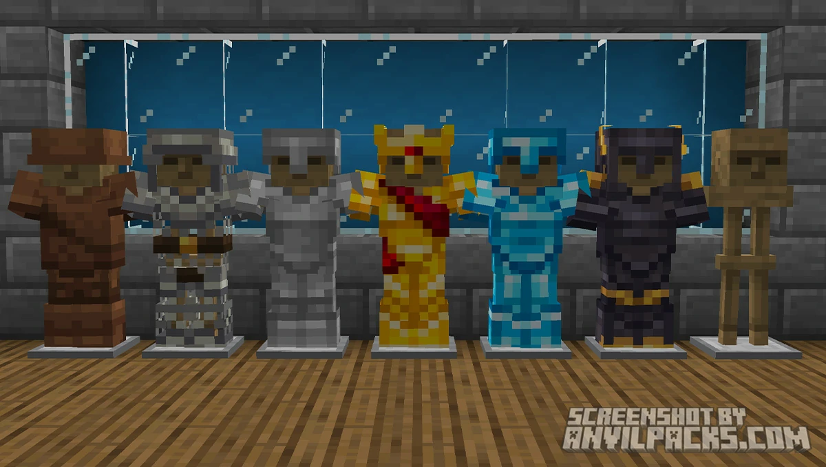Custom GUI. The inventory, crafting, smelting, enchanting, and brewing screens all get custom backgrounds and layouts. They feel themed and purposeful. The brewing stand GUI with the full recipe chart is the standout, but the crafting table and furnace menus also get visual upgrades that make the game feel more polished.