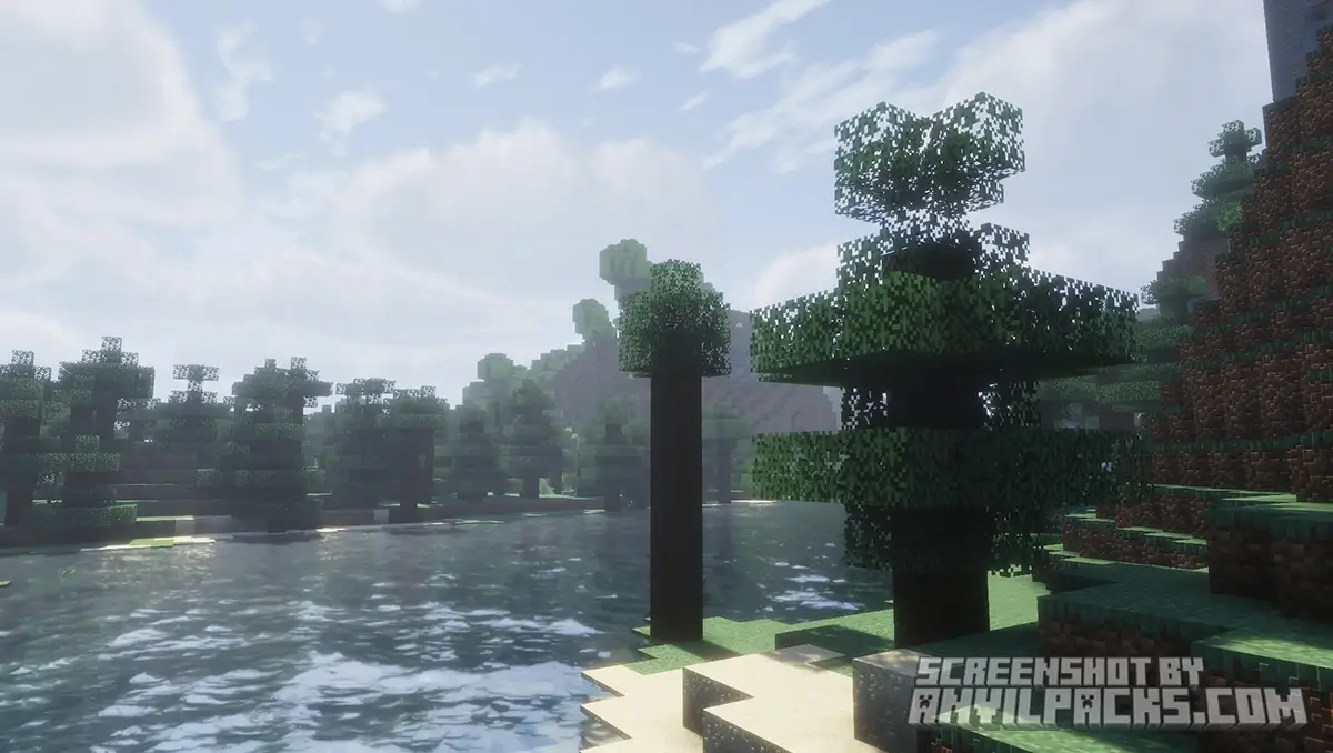 The water is clear with nice refraction, but it keeps decent visibility so you can actually see what you’re building underwater. The lighting is warm. It doesn’t have that “gloomy” realistic filter that some shaders (looking at you, Insanity) force on you.